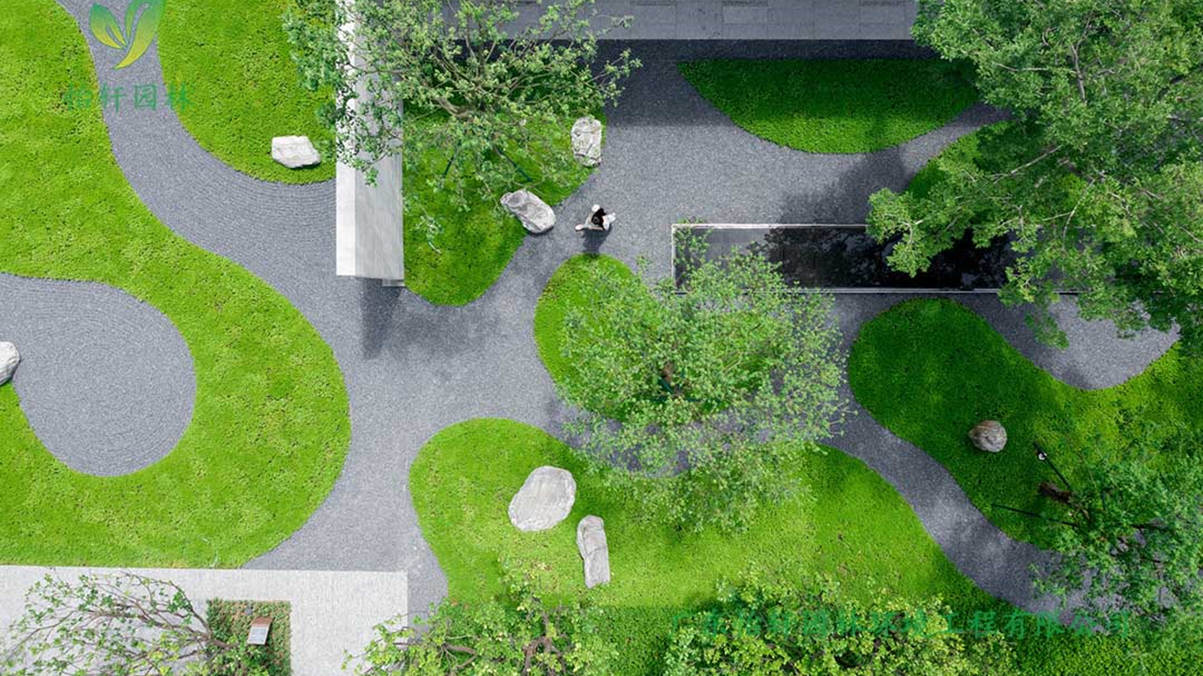 用风雨连廊织起一片园,引人入境。中心型连廊形成环形动线,弱化建筑山墙的实体感,创造丰富的视觉停留,加强记忆节点。中心砾石是用现代极简手法演绎的自然语汇,山、林、光、影等元素被提炼出来,带来小中见大的场景体验。行进至此,多想将自己就隐藏在这份宁静中,又不经意发现一个入口,开启新的旅程。走在廊中,换一种视角看世界。听雨水轻轻滴落,打湿了翠绿的地被,打湿了温润的木座椅;晴天,把影子投在廊下、草上,把这一刻的惬意定格在时光里。