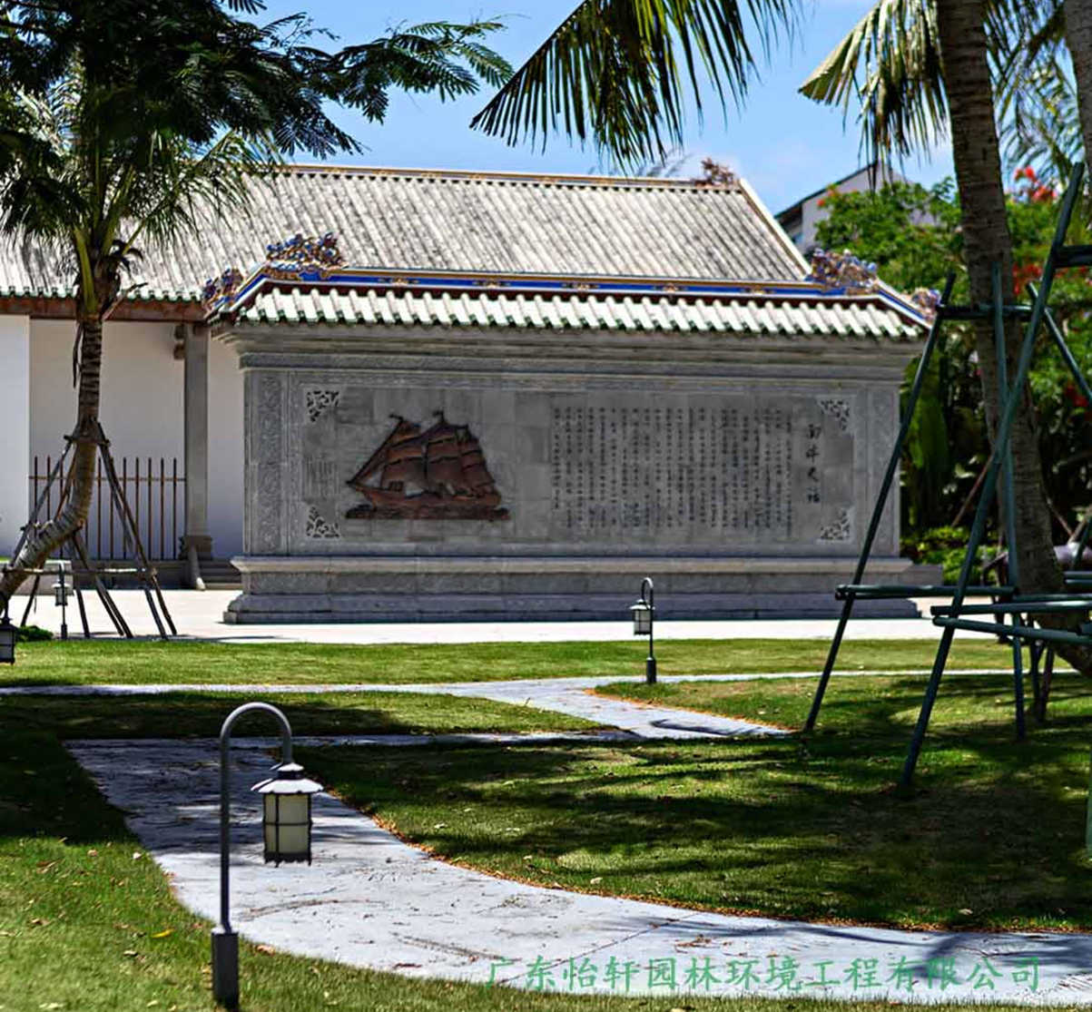 南洋美丽汇置身于山海天国际滨海美丽汇核心区位,项目整体以文昌独特的南洋文化故事线贯穿全局, 旨在打造特色文化旅游目的地。景观设计通过充分发掘南洋历史文化脉络,以“侨乡”文昌四大古宅、宋氏祖居、溪北书院等历史文化遗产为创意蓝本,用“下南洋”为主题故事线,打造诗书耕读、南下之舟、异乡家园、西学东渐、扬帆起航等五大景观空间,将百年历史文脉,定格在南洋古街、文化广场和田海绿地,带来非凡的南洋风情文化体验。踏着古香古色的石板,门前耸立着书香气息的牌坊,绕过牌坊,照壁毅然而立,瓦当、纹饰、线脚细致入微,与书院入口石狮相互映衬,寂静而沉稳的气息不言而喻。书院由前场与内院两部分组成。通过牌楼、照壁、广场和庭院,构成有序的递进景观序列,复刻本真的溪北书院氛围。书院广场入口设牌楼,左右两侧各题楹联:载籍极博,拆中于易书诗礼春秋;学问无他,求益乎身心家国天下。内容取自存的书法著作《楷法溯源》,寓意文化人的崇高理想追求和中国传统文化的博大精深。书院广场照壁正面题写“德以达才”,提炼于传统儒家思想,体现品德修养与知识才能的辩证关系,符合社会主义核心价值观,也契合书院教书育人的文化内涵;照壁背面刻有“南洋史话”,简介下南洋的历史,反映了南洋广大侨胞艰苦奋斗、生生不息的发展史、创业史和寻梦史。