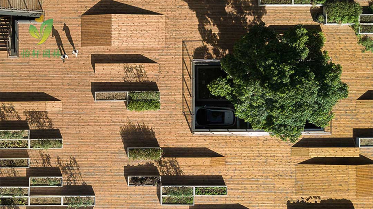 在原有的园区整体布局中,内庭院的西侧是一个室外停车场。为了改善庭院的空间效果和保留停车功能的需求,停车场的上方增添了景观大平台。通过台阶的设置,大平台成为内庭院空间的延续,从而形成不同标高的公共空间体系,而台阶也成为内庭院举办户外活动时的观众座椅。平台上布满了错落有致的混凝土种植槽,不同喜好的人栽种不一样的农作物和灌木花草,形成有趣生动的景观。平台上的大洞口为下面的停车场提供良好的采光,而洞口中间的香樟大树也为停车空间提供绿意。