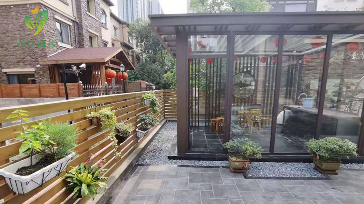景观结合业主居住、会友需求,结合现状条件,怡轩园林绿化公司的景观设计师通过现代简约的设计手法,利用增加高差、设置对景、增加水景等元素来丰富小空间的景观体验,通过栽植树木花草镶边点缀,整体呈现出简洁、干练、大气、爽朗的庭院景观。